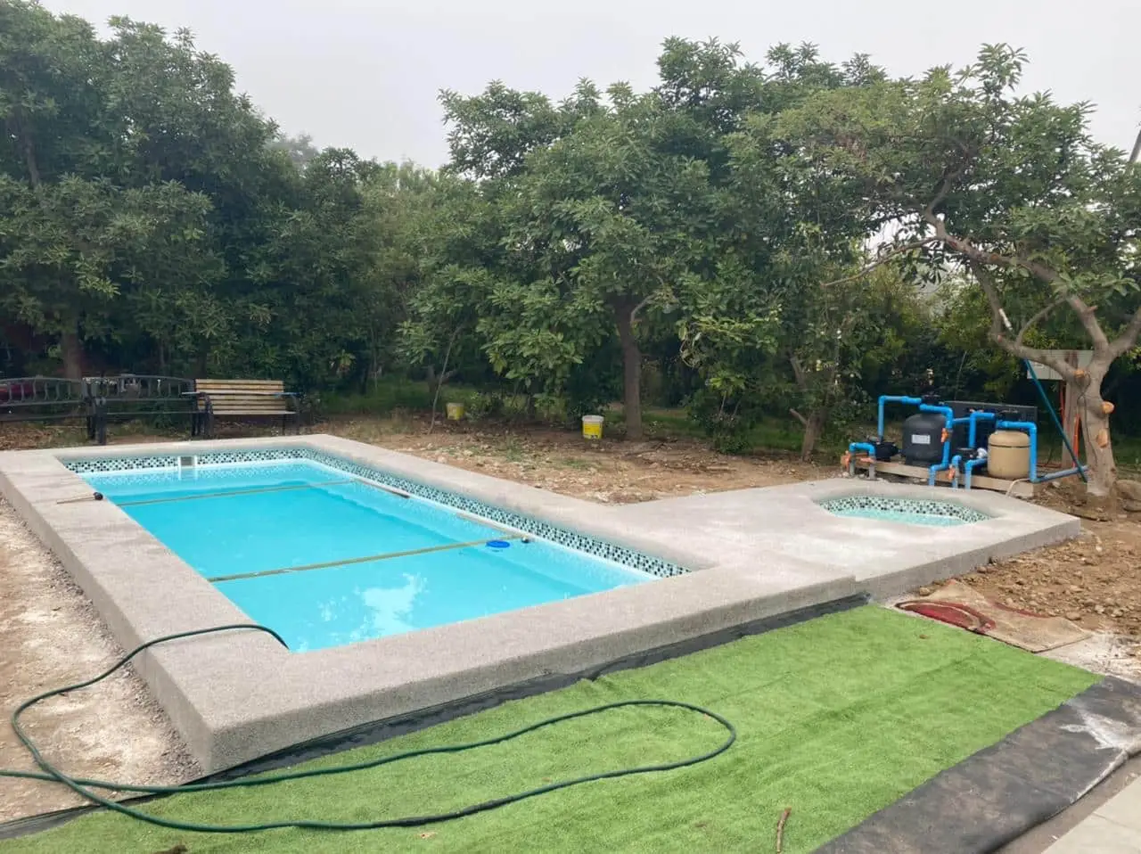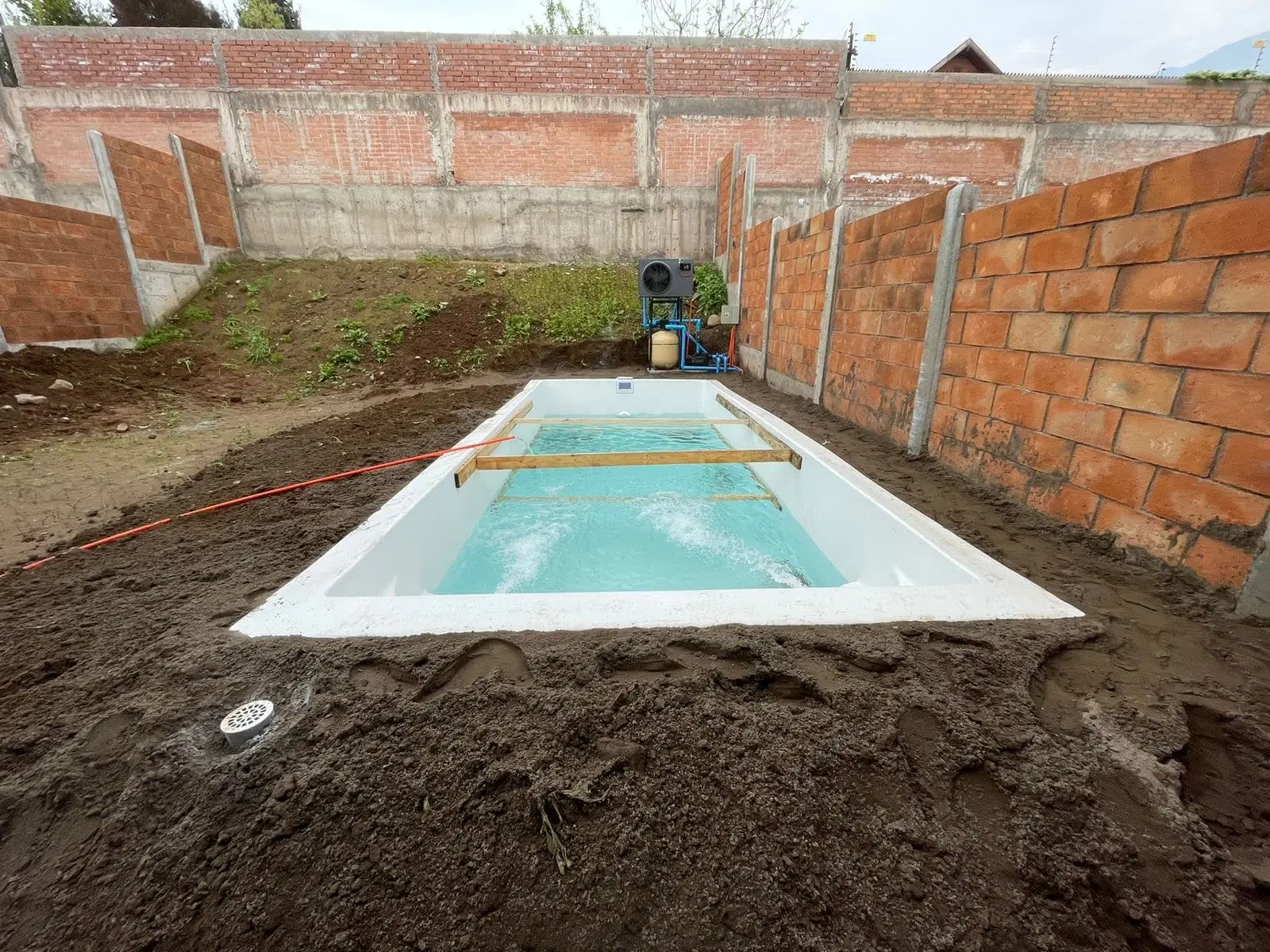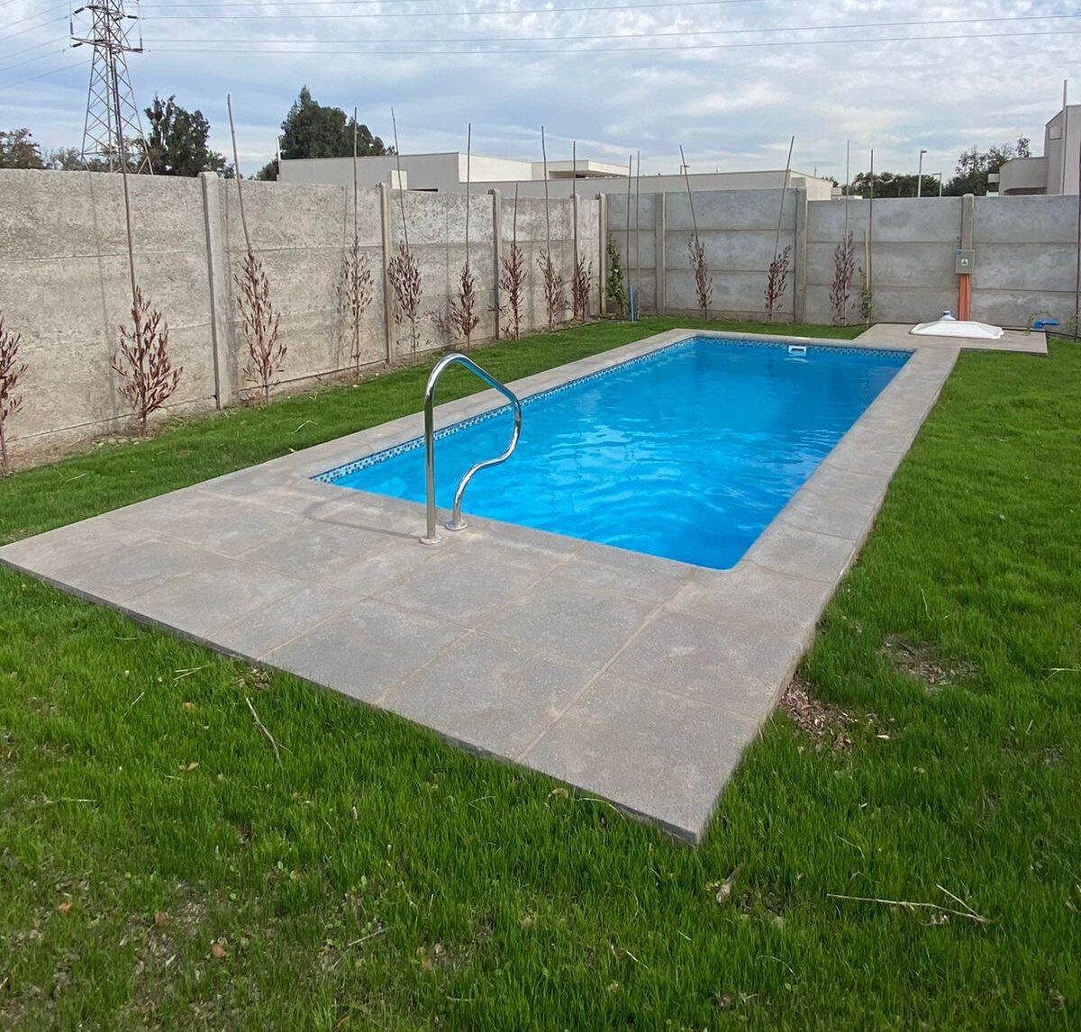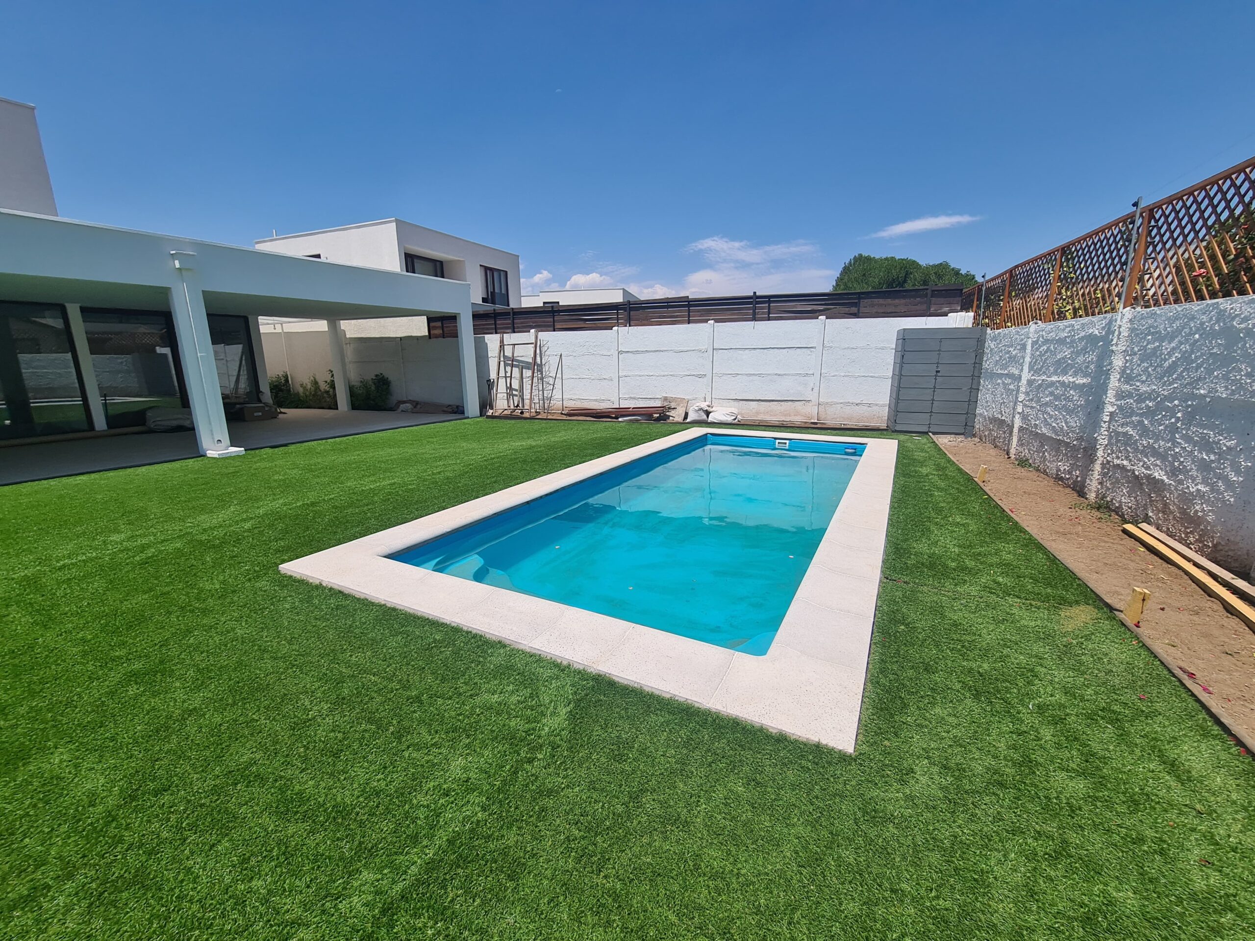 - Piscina de Fibra de Vidrio: Fabricada con materiales de alta durabilidad y resistencia.